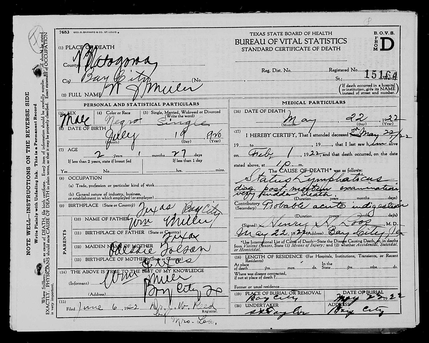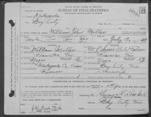Show Bio Place of Birth Bay City, Matagorda, Texas, US Place of Death Bay City, Matagorda, Texas, United States Mother Go to profile page Odessa Eulia Tolson Miller (1902 - 1977) Father Go to profile page Willam Jessie Miller (1901 - 1968) Go to profile page William John Miller (1920 - 1922)